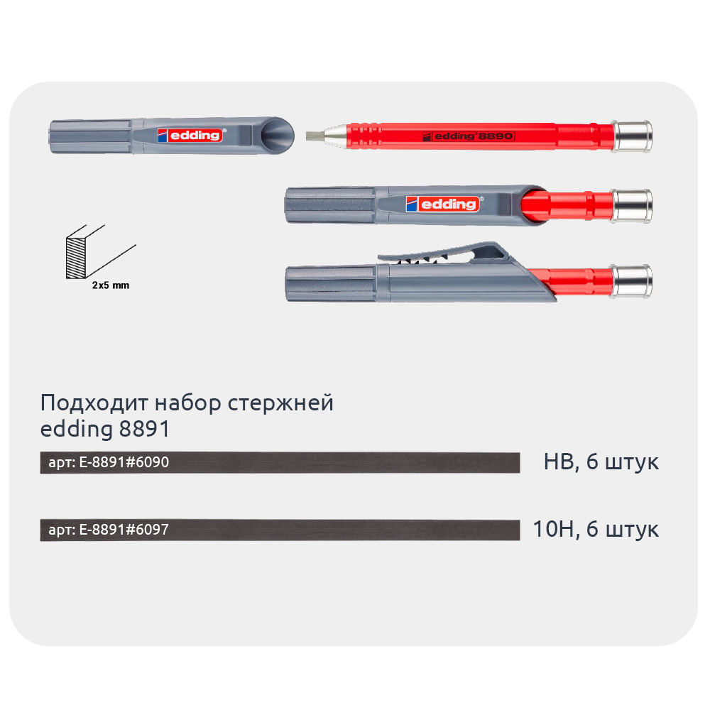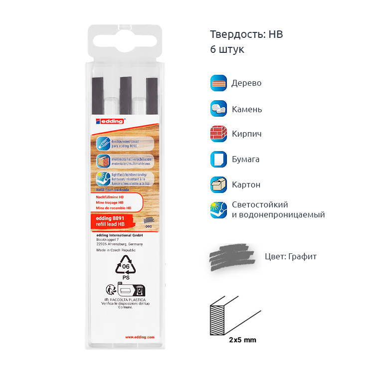 Запасные графитовые грифели edding 8891, твердость HB, подходят для автоматического строительного карандаша edding 8890. Набор из 6 грифелей. Специальное решение для нанесения повседневной маркировки в столярном деле и ремесленном производстве.