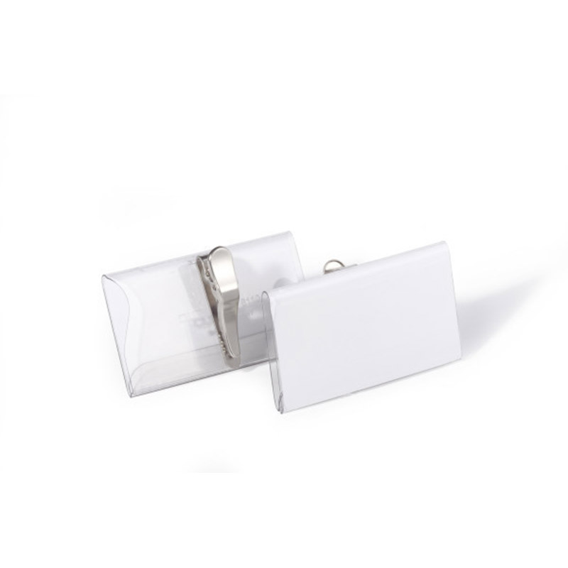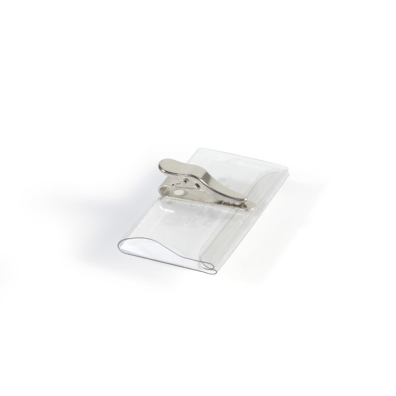 Прозрачный бэйдж с креплением типа «крокодил» крепится к любой одежде.