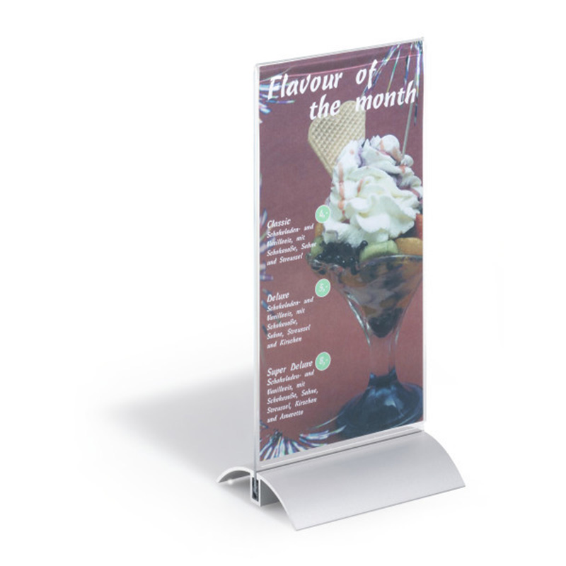 Элегантные настольные таблички для размещения информации, меню, объявлений и спец-предложений. Информационная панель из акрила вставляется в алюминиевое основание и прочно удерживается резиновым фиксатором. Информация располагается с обеих сторон таблички.