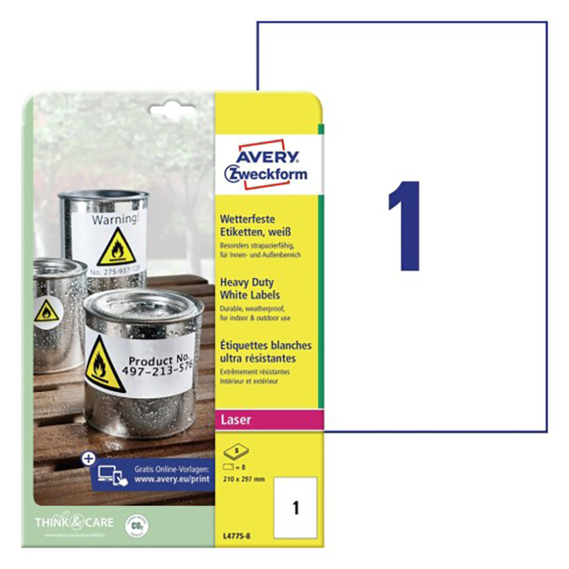 Прочные белые водостойкие этикетки из полиэстера размер 210 х 297 мм, для печати на лазерных принтерах. 8 этикеток, 8 листов. Благодаря сильному клеевому составу этикетки предназначены для надежной и прочной маркировки на улице или в складских помещениях. Они масло и грязестойкие, термостойкие, выдерживают перепады температур (от -20 °C до +80 °C) и водонепроницаемые. Идеальный вариант для инвентаризации в складских помещениях, маркировки коробок, ящиков, складских вещей. Благодаря бесплатному программному обеспечению и шаблонам Avery Zweckform вам совсем не нужно тратить время на дизайн и печать этикеток и самоклеящейся бумаги А4. Мы предлагаем большой выбор дизайнов и готовых шаблонов для печати. Просто введите номер артикула с упаковки, выберите нужный дизайн, создайте свою этикетку и распечатайте! Готово!