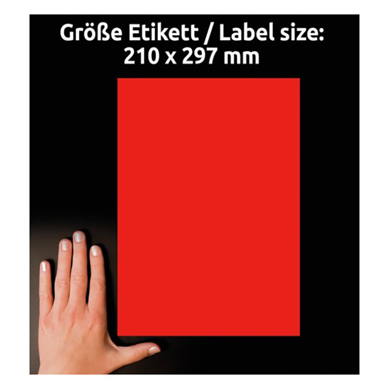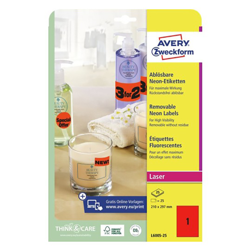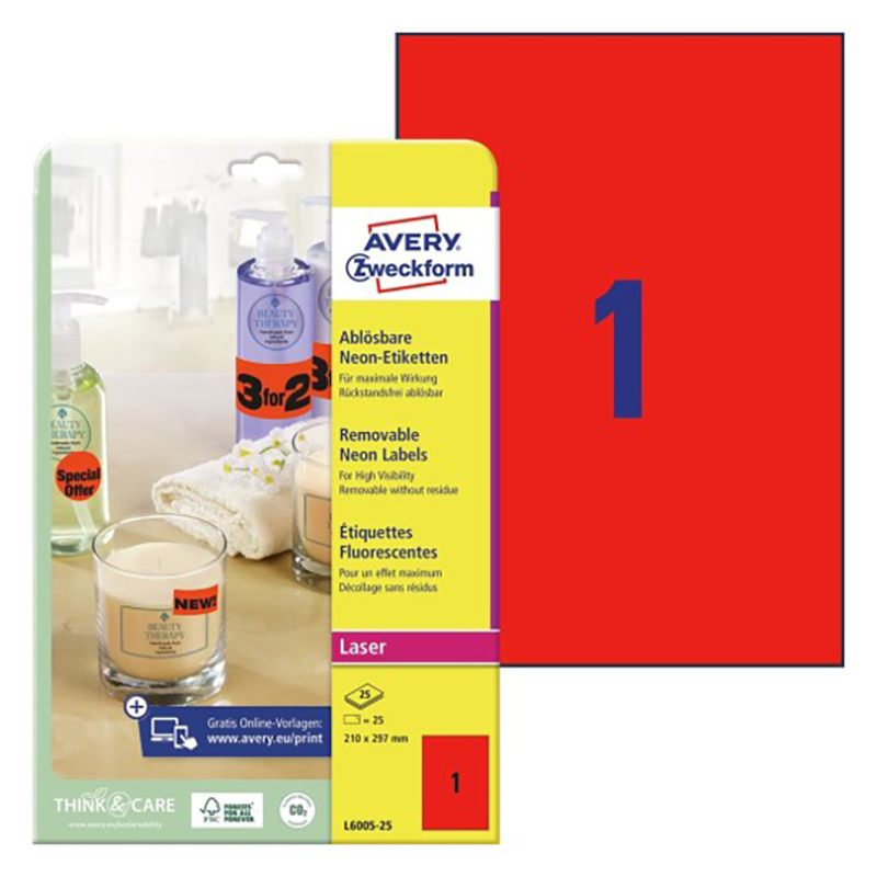 Тестеры, бесплатные образцы, скидки, реклама – все средства хороши для стимулирования эффективных продаж вашей продукции. Обратите внимание ваших клиентов, используя наши привлекающие внимание неоновые этикетки. Красные этикетки для печати на лазерных принтерах, размер 210 х 297 мм. С этими этикетками невозможно не заметить продукцию на полке или важную информацию об акции! Этикетки легко удалить после использования! Придумайте собственный дизайн или изображение, выбрав нужную цветовую гамму из коллекции специальных шаблонов от Avery Zweckform. Благодаря бесплатному программному обеспечению и шаблонам Avery Zweckform вам совсем не нужно тратить время на дизайн и печать этикеток и самоклеящейся бумаги А4. Просто введите номер артикула с упаковки, выберите нужный дизайн, создайте свою этикетку и распечатайте! Готово!